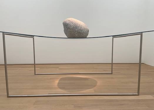Het heldere, kwetsbare glas draagt de steen én buigt voor de kracht van de aarde.